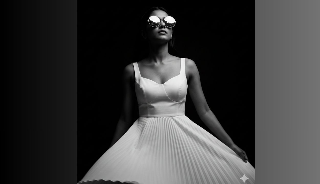 A dramatic and ultra-realistic black-and-white close-up with high-contrast cinematic side lighting, highlighting the contours of the face and casting deep shadows. The person is an beautiful Indian girl wearing white dress with a fitted bodice and flowing pleated A-line skirt round reflective sunglasses, gazing confidently upward into a dark void. The sunglasses reflect a city skyline. Skin texture remains natural and realistic. The atmosphere is mysterious with a minimalist black background. Details in 8K.
