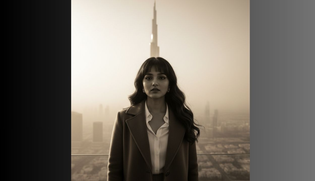 Create a hyper-realistic cinematic image in black and white of a person (preserve face) standing on Bhuj Khalifa. The person wears a white shirt and brown coat, illuminated by golden daylight with soft mist. The camera angle is wide and slightly low, making the person appear majestic. Shot in 16:9 ratio with dramatic contrast and film noir aesthetics.