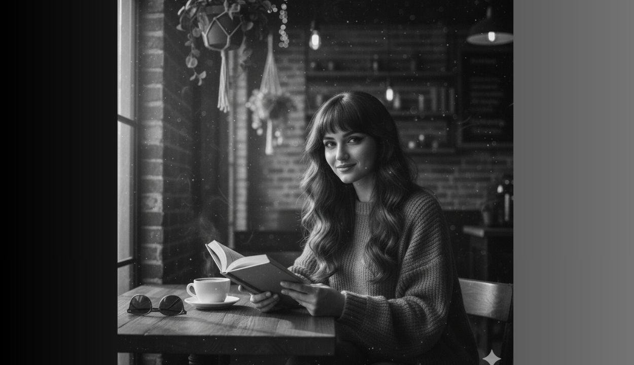 Create a hyper-realistic cinematic black and white portrait of a woman (preserve face) with long wavy brown hair, looking directly at the viewer with a gentle smile. She is wearing a cozy, loose-fitting, sweater. She is seated comfortably at a wooden table next to a large window in a warm, inviting coffee shop, holding an open book in her hands as if she just paused reading. A steaming cup of coffee is on the table beside her, along with a pair of sunglasses. The setting is a rustic yet modern coffee shop with exposed brick walls, hanging potted plants, and warm, dim ambient lighting from string lights and a few industrial-style fixtures in the background. Natural light streams in through the window from the left, creating a soft glow around her and gentle highlights on her hair and skin, with subtle dust motes visible in the sunbeams. The background softly blurred to emphasize her as the main subject. The overall aesthetic should be warm, cozy, and inviting.