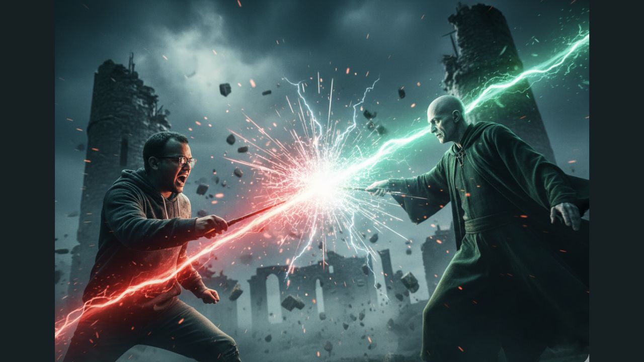 A hyper-realistic, cinematic low-angle shot depicting a high-stakes magical duel amidst gothic castle ruins. On the left, the uploaded face as reference, wearing round glasses and a dark hoodie, lunges forward with a wand, projecting a beam of intense red energy. Opposite him, a pale, bald antagonist in flowing dark emerald robes counters with a jagged green spell. The two energies collide in a violent central burst of sparks and plasma, illuminating the scene with dramatic chiaroscuro lighting and high-contrast teal and orange colour grading. The background features a crumbling stone tower against a turbulent, storm-clouded sky. Rendered in 8k with volumetric fog, raytracing, subsurface scattering, and intricate particle details.