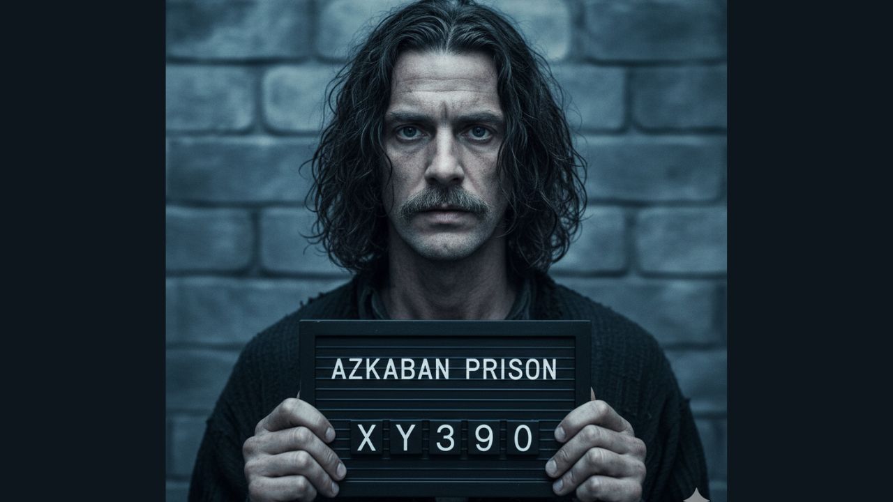 A cinematic medium close-up mugshot featuring a dishevelled prisoner with “uploaded face as reference”, characterized by long, messy, wavy dark hair and a Mustache. He holds a heavy, textured black prison placard chest-high, clearly inscribed with “AZKABAN PRISON” across the top and a runic alphanumeric code “XY390” in individual slots below. The lighting is moody and cool-toned with a desaturated blue colour grading, emphasizing realistic skin texture and grime. The background is a soft-focus, blurred grey stone wall, creating a shallow depth of field. The image quality is high-fidelity 8k, resembling a photorealistic movie still with sharp focus on the subject and placard, accented by slight film grain and a sombre atmosphere.
