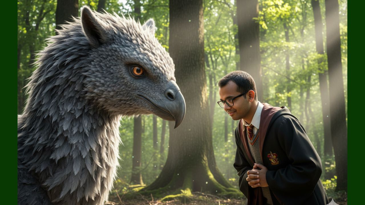 A vertical cinematic shot captures a magical encounter in a sun-dappled forest, featuring a young wizard with “uploaded face as reference” wearing a black school robe, white shirt, and red-and-gold striped tie, bowing respectfully with a slight smile. To the left, the large, detailed head and neck of a grey Hippogriff dominate the foreground, featuring intricate feathered textures, a sharp beak, and a piercing orange eye. The background consists of towering tree trunks and a dense canopy of bright green leaves filtering natural sunlight, creating a high-contrast, atmospheric woodland scene with photorealistic textures, 8k resolution, and a 35mm focal length aesthetic.